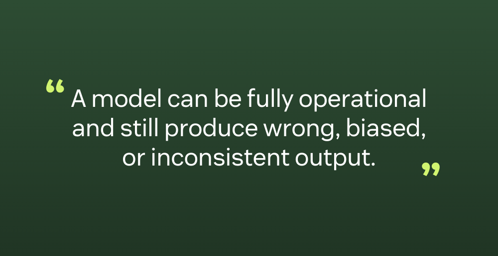 AI systems don’t fail the way traditional code does. A model can be fully operational and still produce wrong, biased, or inconsistent output. Two identical inputs can lead to very different outcomes depending on retrieved context, models, or even subtle prompt variations.