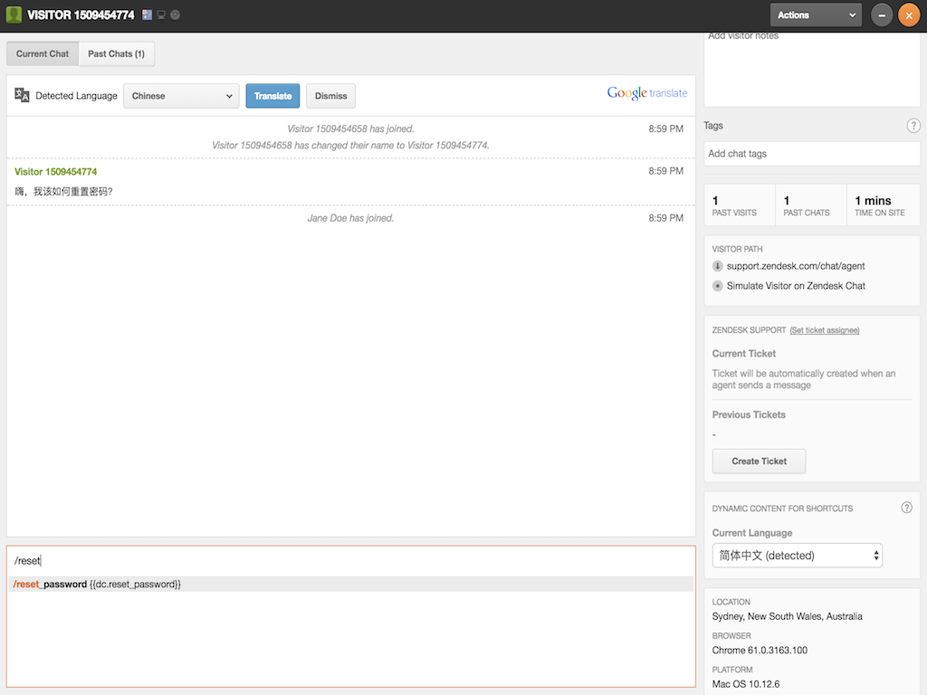 Begin a chat in Zendesk Chat and start chatting. Based on the visitor language detected, your selected shortcut in the appropriate language variant will be displayed for you to use.