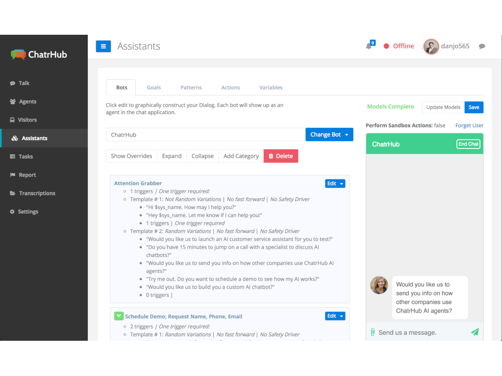 With ChatrHub you can:1. Build complex chatbots using a simple setup wizard or let ChatrHub build a professional chatbot for you!2. Setup chatbots on websites, social media, and text messaging.3. Get copied on all customer and A.I. conversations if the A.I. misinterprets the conversation. Interject a conversation if needed.4. Setup one or more chatbots. Pay for only what you use.5. Connect to your backend systems for automatic self-service and more!