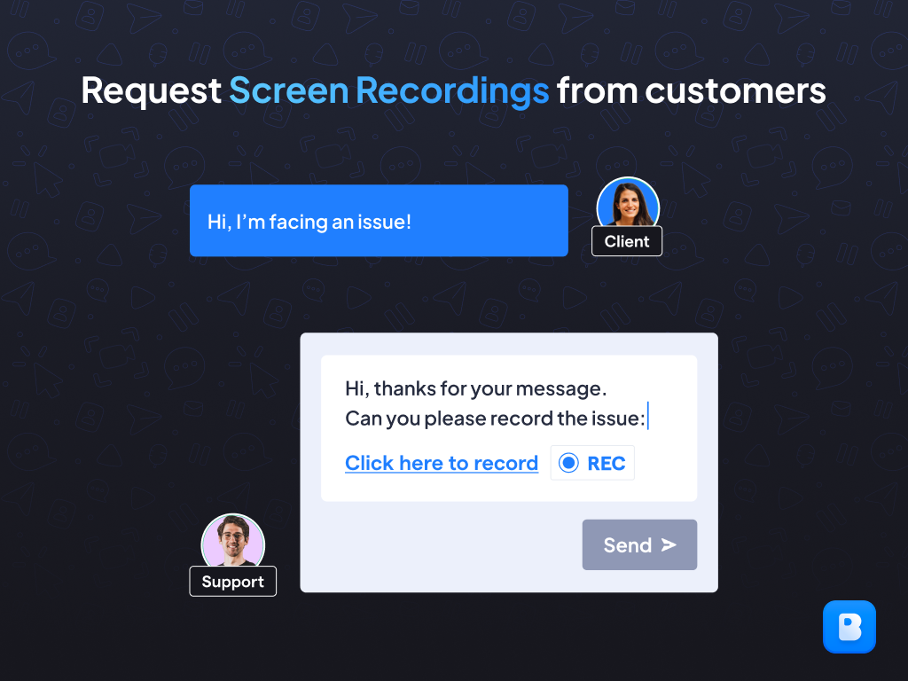 Skip the back-and-forth. Enable customers to record their screens to show issues instead of explaining them via text or live calls.