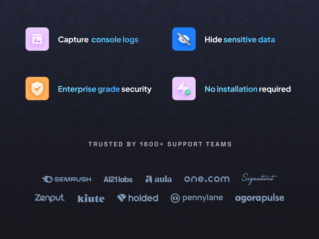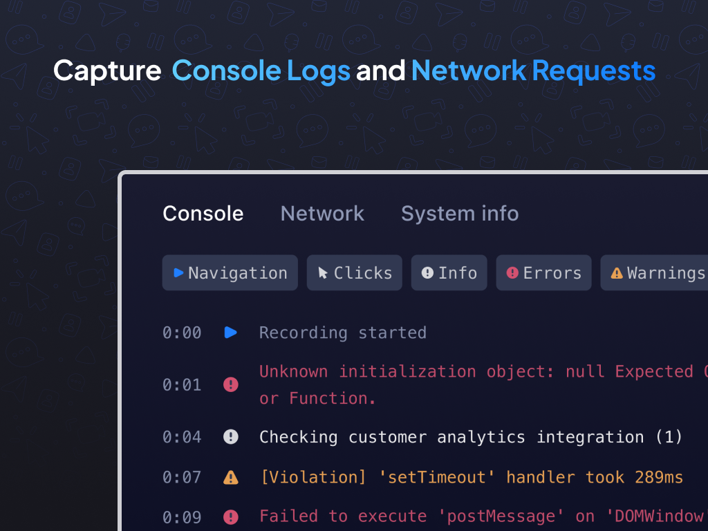 Automatically collect console logs, network activity, device details, and session metadata to equip your developers and Level 2 agents with the insights they need for faster troubleshooting.