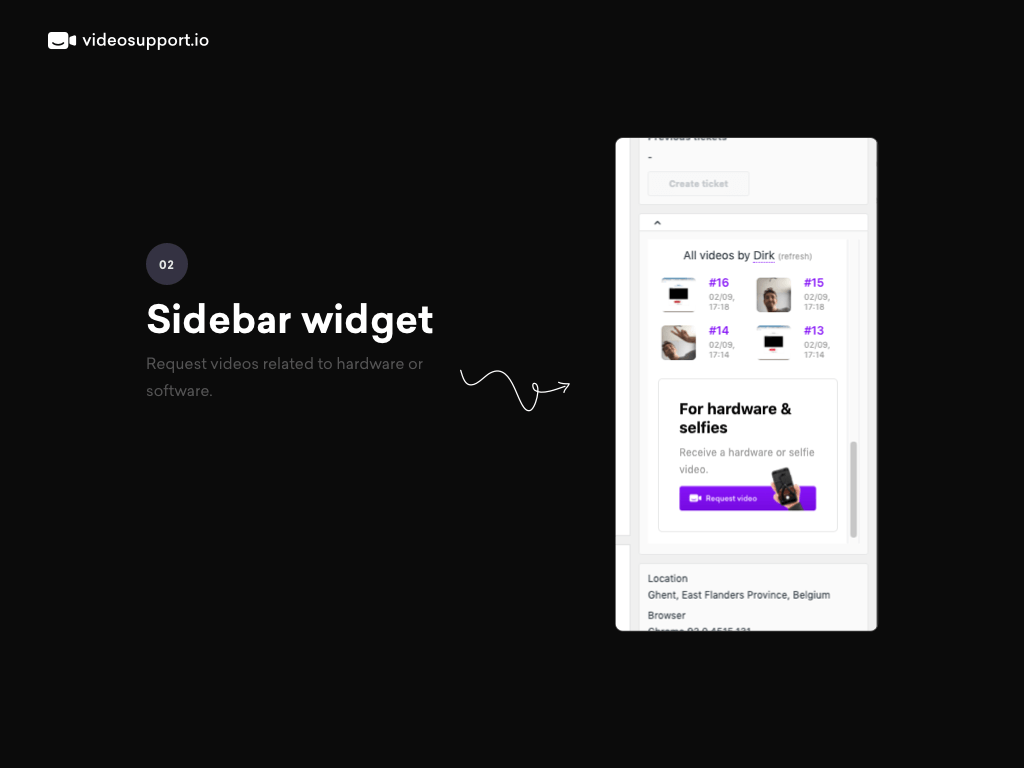We allow your customers to record videos in the browser and directly share them with your support team. No customer installs required.