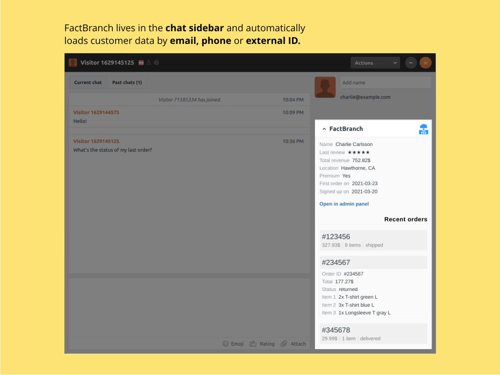 Show customer info from any system right inside the chat sidebar. Real-time data, zero syncs, no more tab-switching.