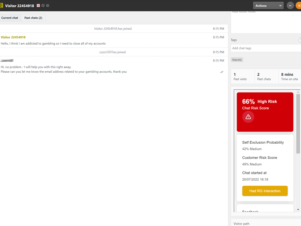Customers also gain access to the Rdentify User interface which allows for real time monitoring of all Live Chat, bot, or email conversations on one screen, so Customer Support management and Compliance teams can stay on top of the risk.