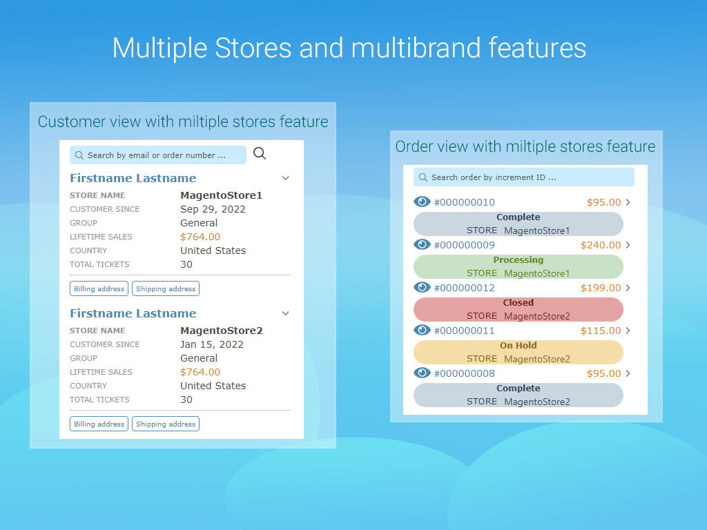 The application by default uses the ticket requester email for searching and looks for information on the Magento 2 store. Found information is divided into detailed data about the customer and all orders associated with this customer. In addition, the application can connect several Magento 2 stores at the same time and display information for each store.
