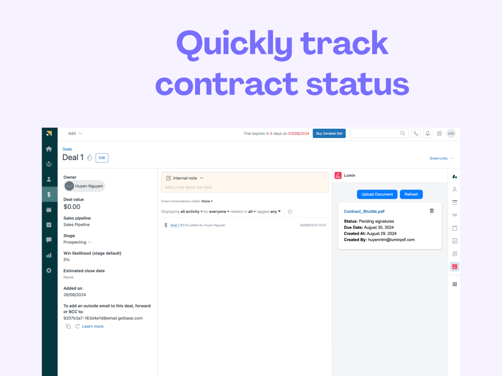 Enhance Collaboration: Team members can tracking the signing status in real-time within Zendesk Sell. This improves communication and ensures everyone is on the same page.