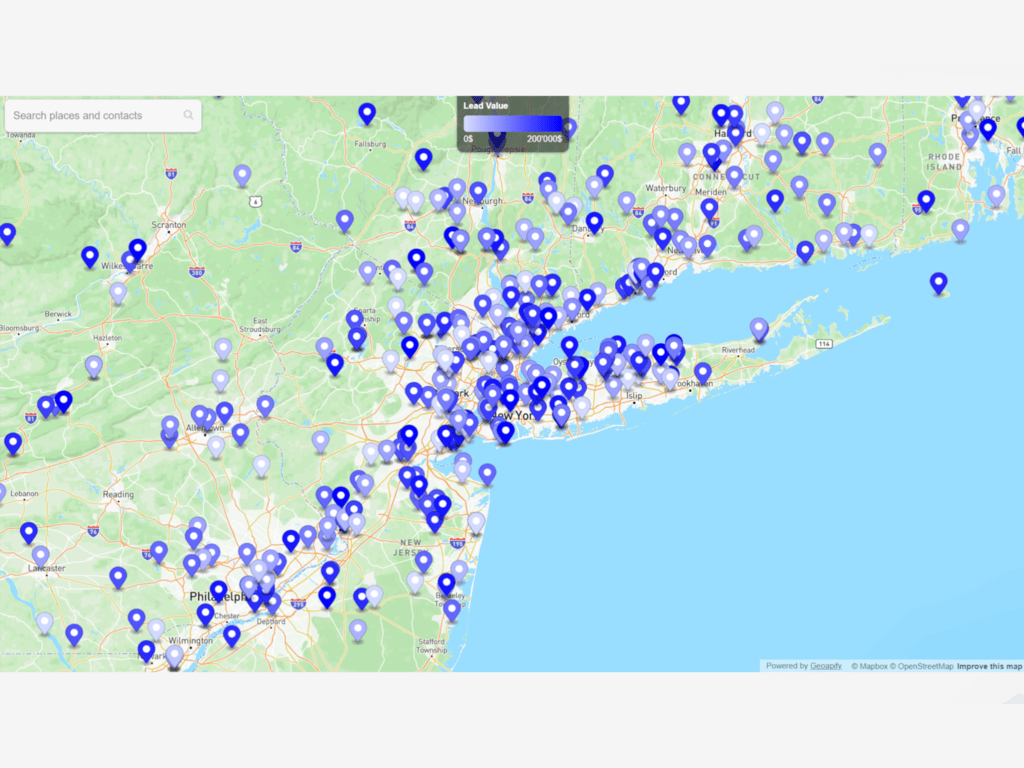 Gain superior oversight of your business operations using our powerful map feature that provides a bird's eye view of all accounts and prospects. Make informed decisions with ease using the intuitive data visualization that identifies growth potential and areas requiring improvements in real-time!