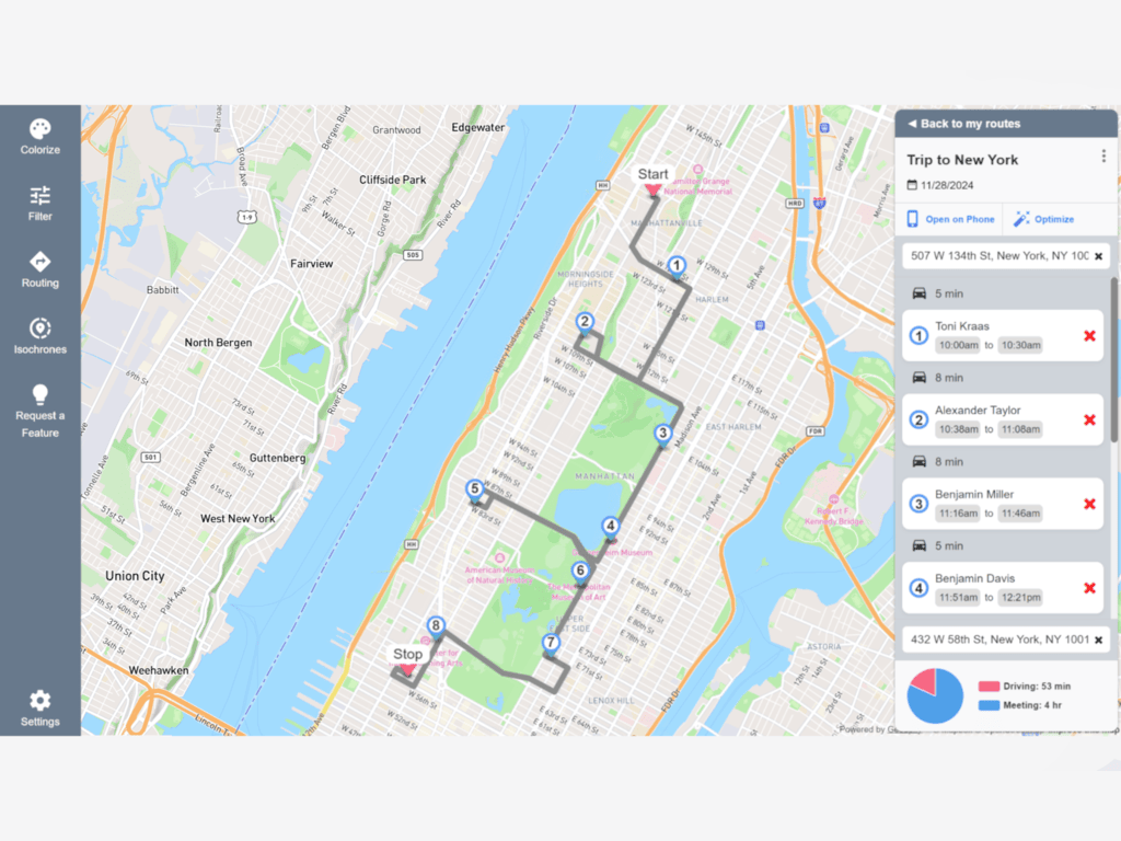 Our route planning tool is an added advantage that optimizes travel routes to maximize efficiency by minimizing travel time while avoiding traffic congestion - thus reducing fuel costs without sacrificing quality face-time with clients or prospects alike!