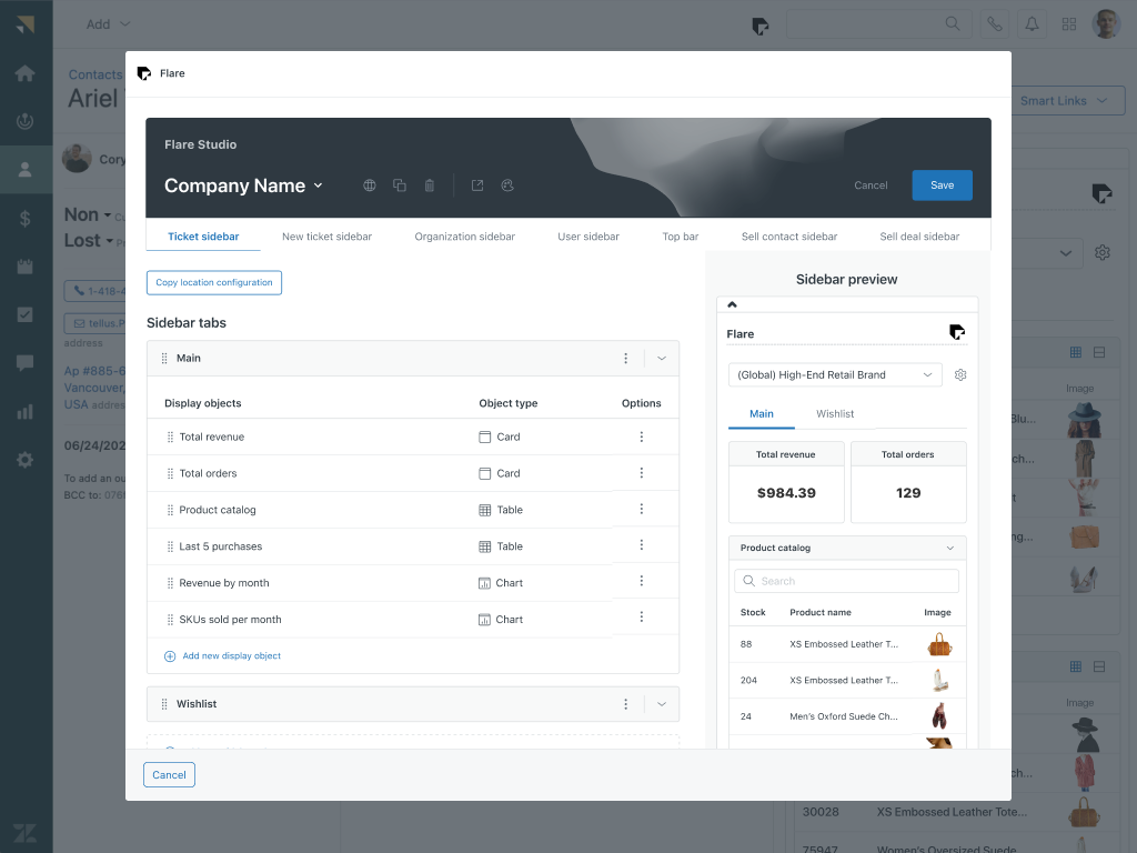 Bring your external data to life within Zendesk by using the no code Flare Studio. Flare Studio enables you to build contextual table, chart, or card sidebar objects from your connected data within minutes—making sure your agents can focus on the information that is most critical to your customer support process.