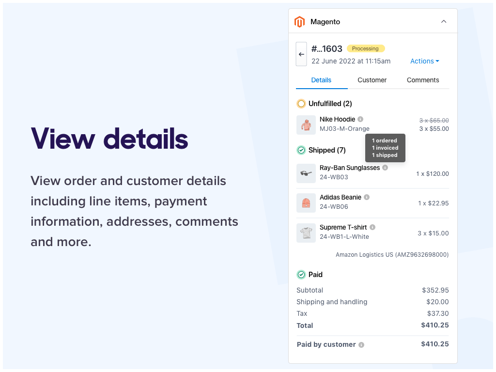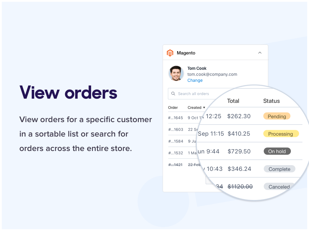 This powerful yet intuitive integration app delivers customer and order information from your Magento 2 store(s) directly within Zendesk Sell. The user interface has been designed to ensure you have access to the right information at the right time, eliminating the need to switch back and forth between screens and allowing you to focus on what matters.