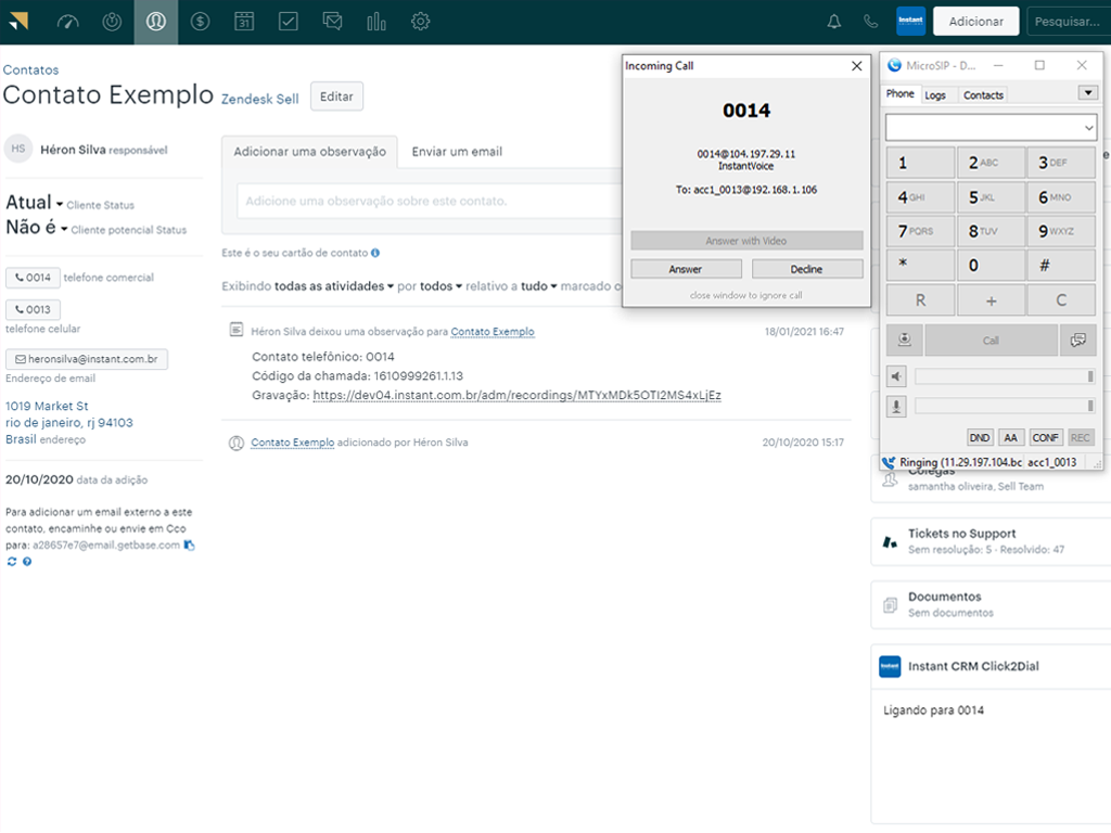O aplicativo permite o 'click-to-dial' - chamadas podem ser feitas com 1 clique, adicionando automaticamente comentários aos contatos com a gravação de áudio da chamada, e também adicionando o código do cliente no Zendeks Sell aos relatórios de chamadas da Instant.