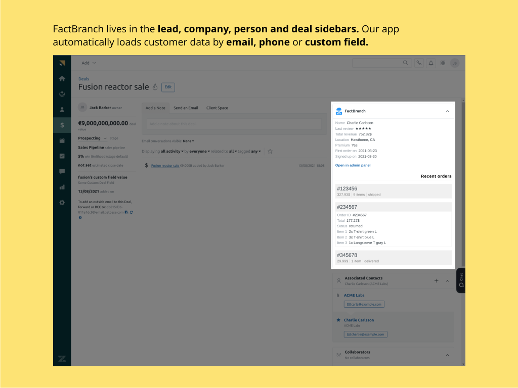 - Seamless integration: Results are displayed directly in the lead, company, person and deal sidebars.