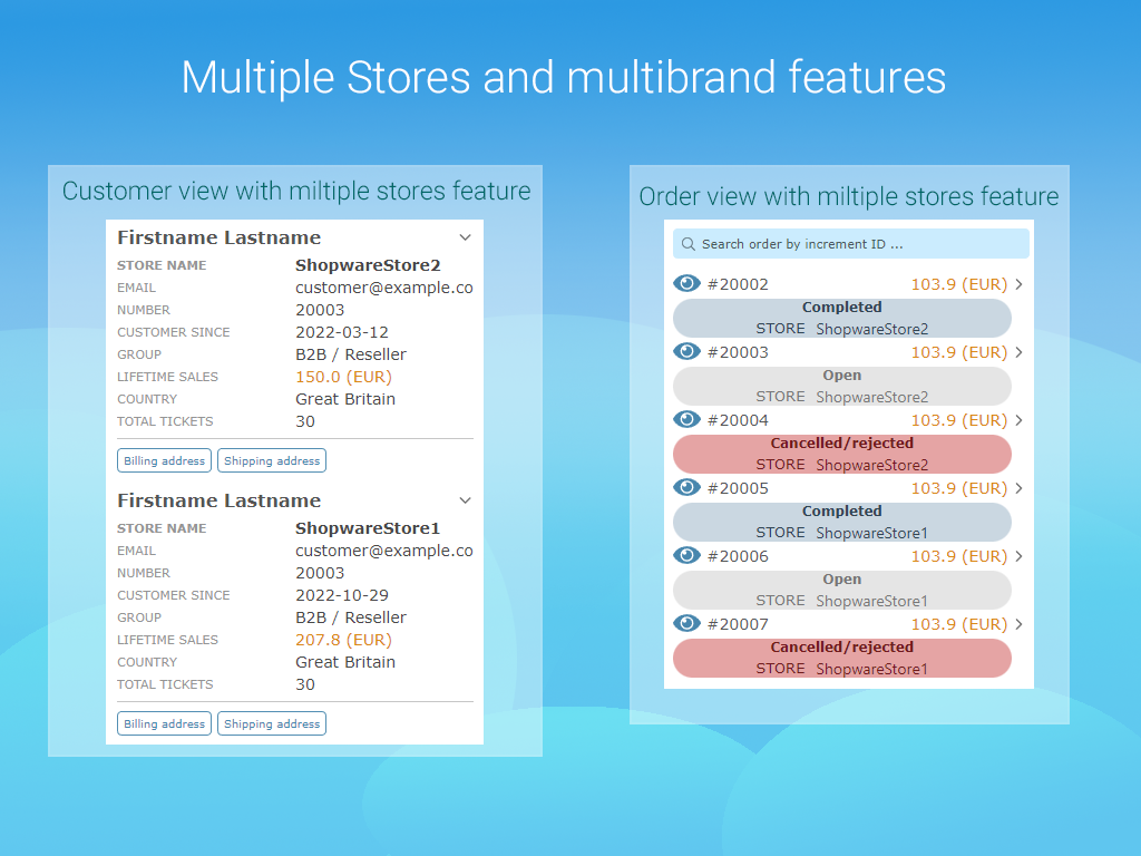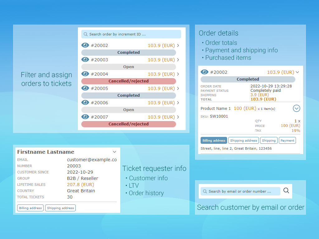 The application by default uses the ticket requester email for searching and looks for information on the Shopware 5 store. Found information is divided into detailed data about the customer and all orders associated with this customer. In addition, the application can connect several Shopware 5 stores at the same time and display information for each store.