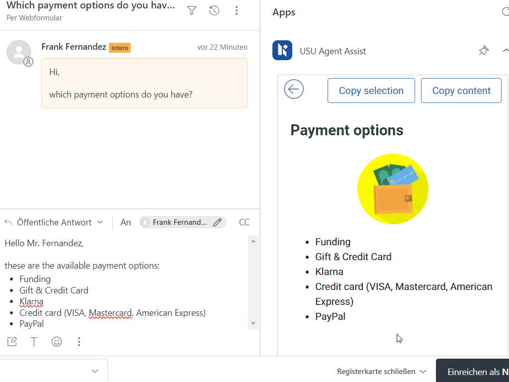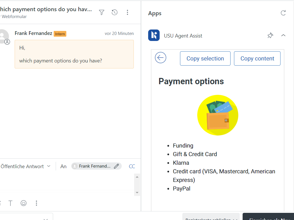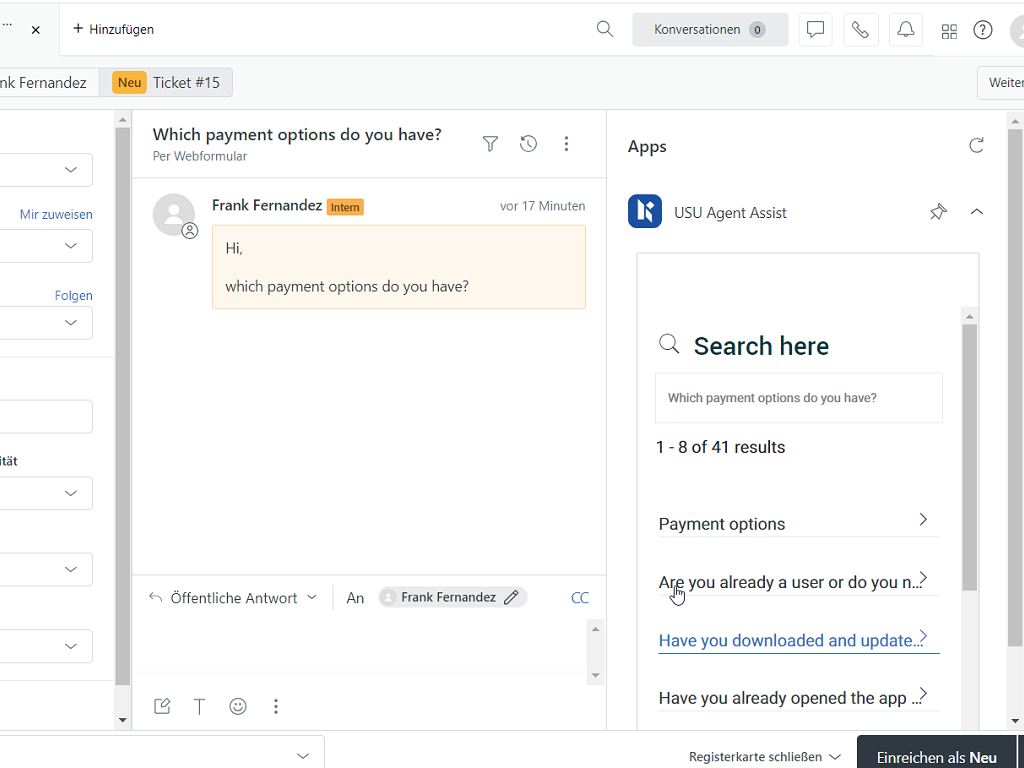 USU Agent Assist gives agents immediate access to the information they need when and where they need it — all without leaving Zendesk. The USU Agent Assist widget automatically searches for information relevant to the current open issue and displays it compactly in a widget. The agent can solve the issue using the information or can take over parts of it that are relevant to the solution.