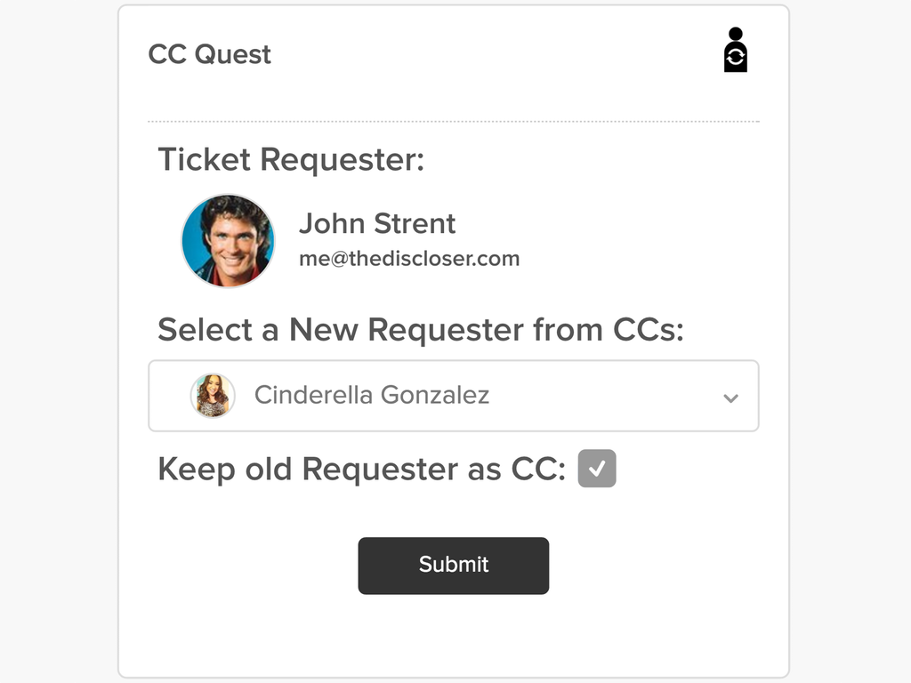 Gives you the option of adding the old Ticket Requester to the list of CCs.
