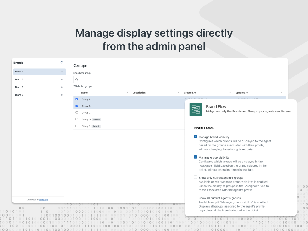 Brands Flow is designed to streamline your Zendesk workspace by providing a fully customizable environment for managing brands and groups. Follow this guide to seamlessly install and configure the app to suit your organization’s unique needs.