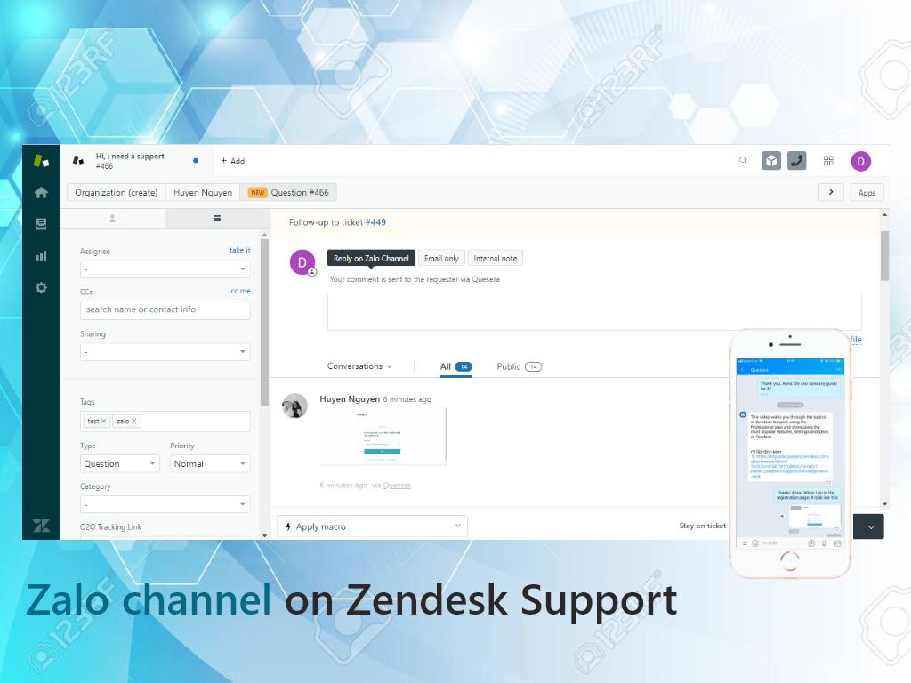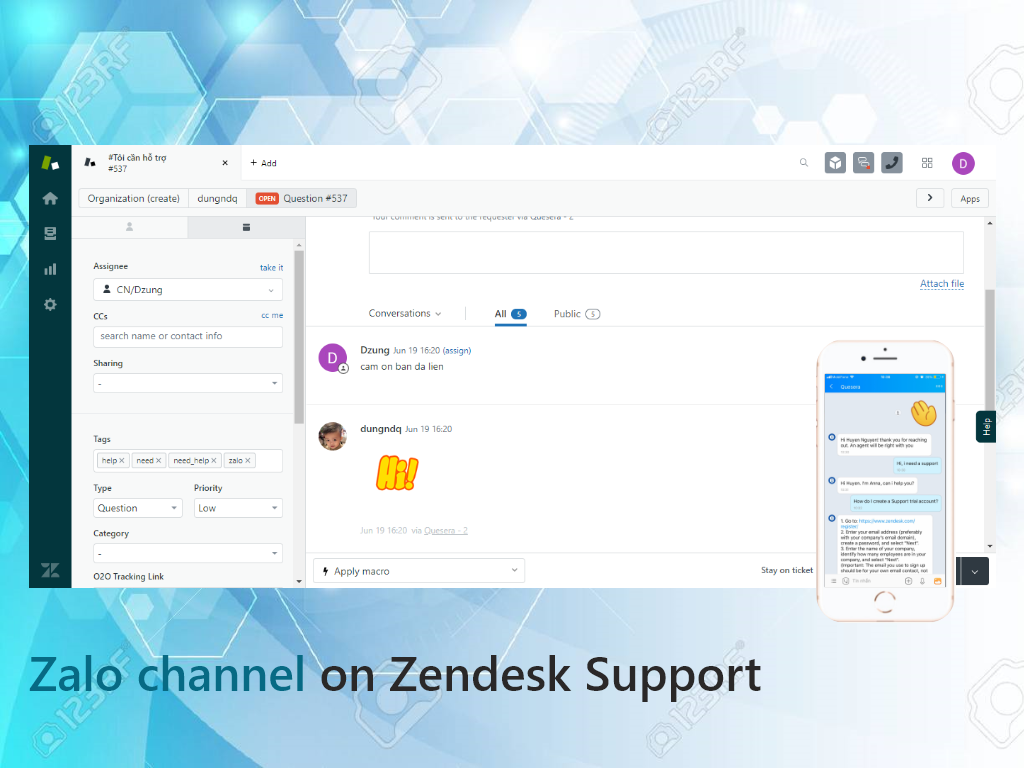 With Zalo Channel integration, Zendesk clients can connect and interact with their customers and Zalo users directly and help you create and handle all Zalo messages into your Zendesk workflows.