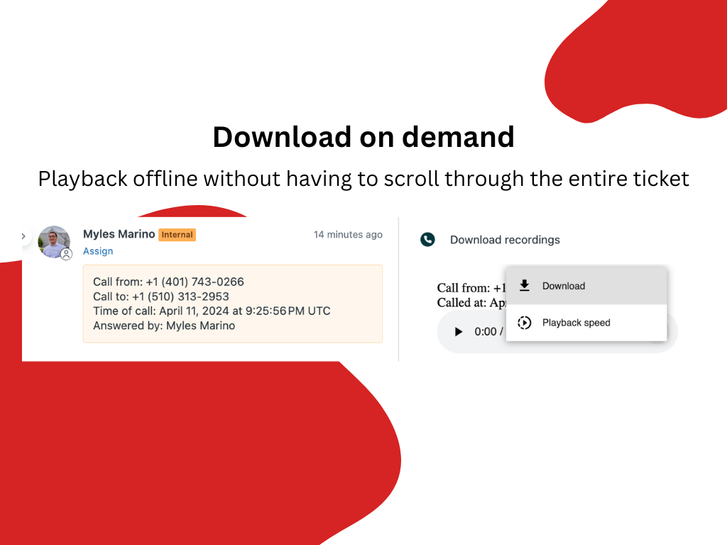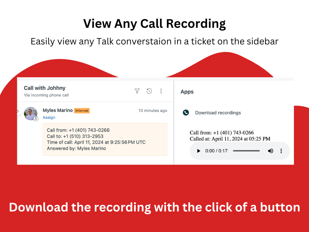 Gone are the days of scrolling through the ticket just to find a specific Talk conversation. With Download Recordings, you'll immediately notice how you can seamlessly access all of the current conversation's conversations in the sidebar.