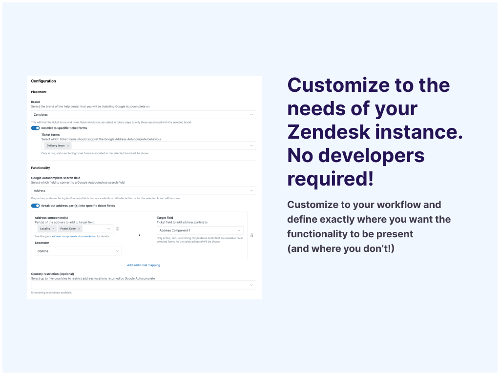 Integrate the power of Google Address Autocomplete to your Zendesk help center ticket forms to: