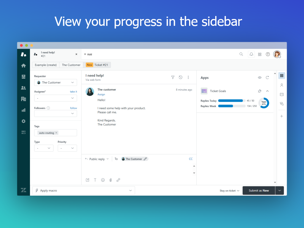 This app enables admins to set ticket goals for all team members and displays the goal progress in the ticket sidebar.