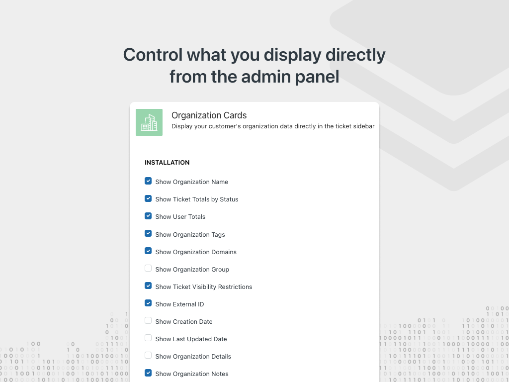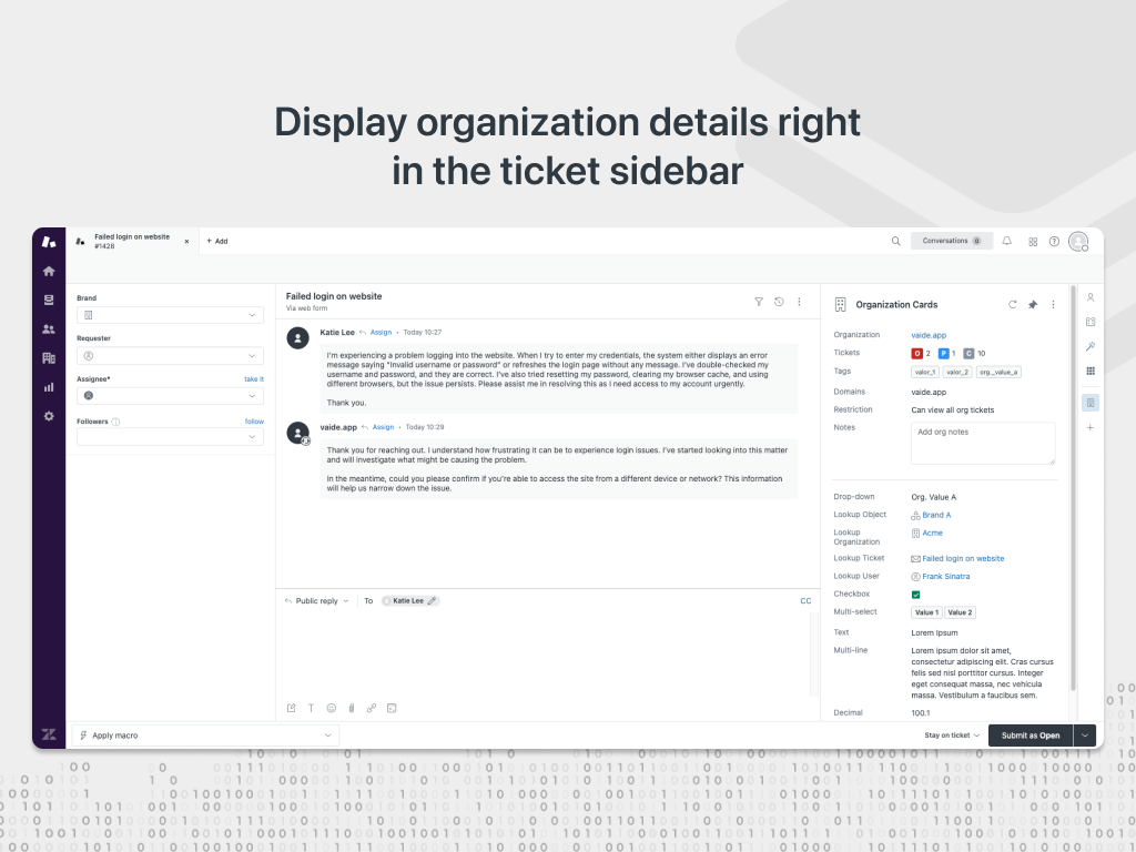 - 🔍 Tailored Data Display: Configure which organization fields are visible, ensuring agents only see the most relevant information for each ticket.