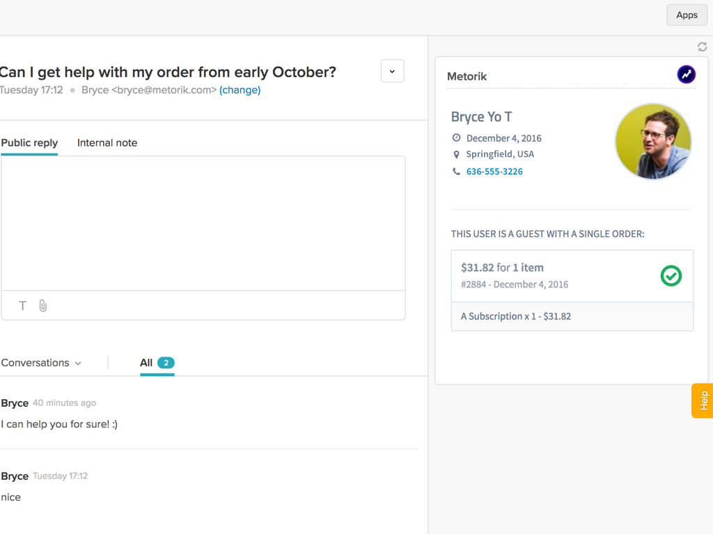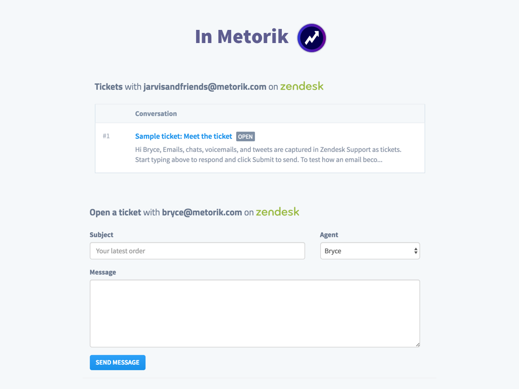 Metorik offers a 2-way integration with Zendesk that's included for free with your Metorik account. The Metorik app for Zendesk pulls in customer and guest data from Metorik into Zendesk so you can get a better understanding of the customer you're talking to, including: