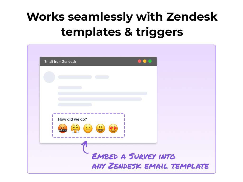 Surveys are embedded in the emails you’re already sending, not separate ones. They seamlessly integrate with Zendesk’s event-triggered or time-based workflows for effortless automation.