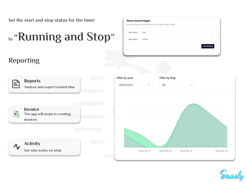 The app lets you customize the start and stop statuses for the timer to align with your business workflow. For example, you can configure it to start the timer when a ticket is marked as ‘open’ or ‘pending’. This ensures that whenever an agent updates the ticket status to one of these options, the timer automatically begins.