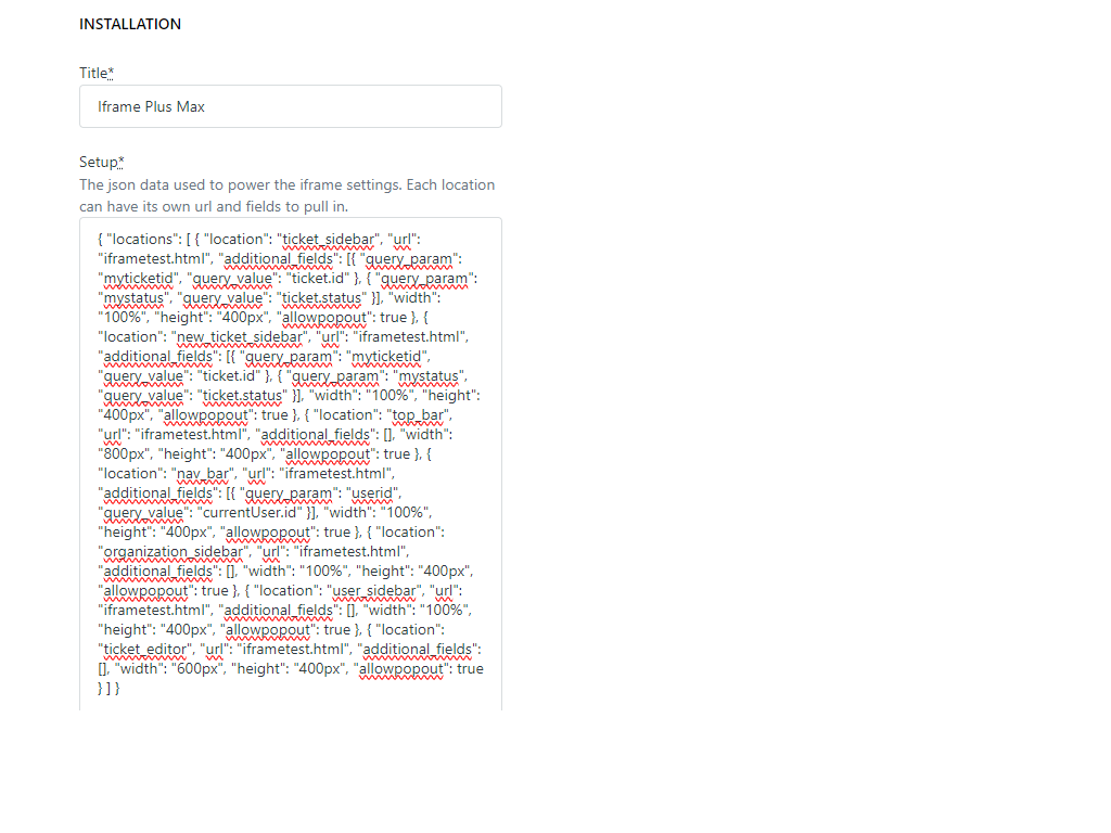 When installing, you need to specify the JSON settings file. Each location can be configured separately. Use the default JSON provided in the Setup or copy from below. The JSON must be present for all locations for the app to work. Just set any URL value to a blank string if you do not want the app to appear in that location.