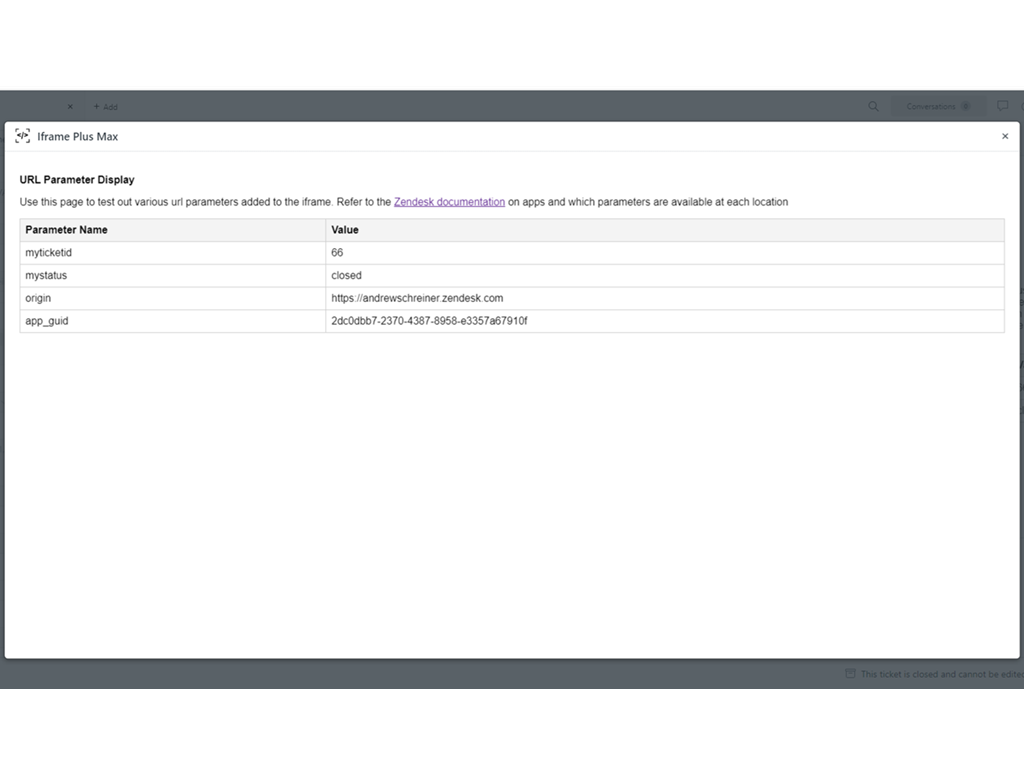 - The additional fields specified are the url parameters added to the querystring for the iframe. You can use the included iframetest.html file to validate that your fields are pulling in correctly. All fields available from the Zendesk documentation can be used in the locations specified.