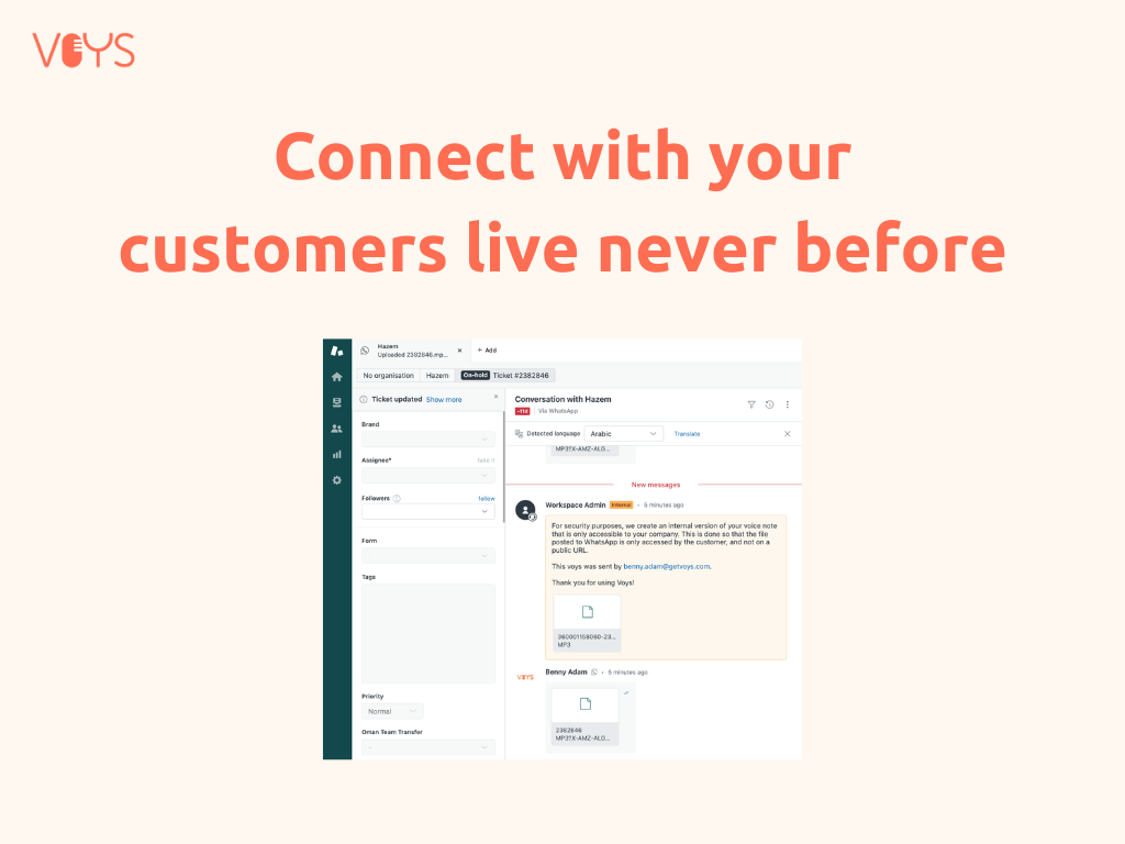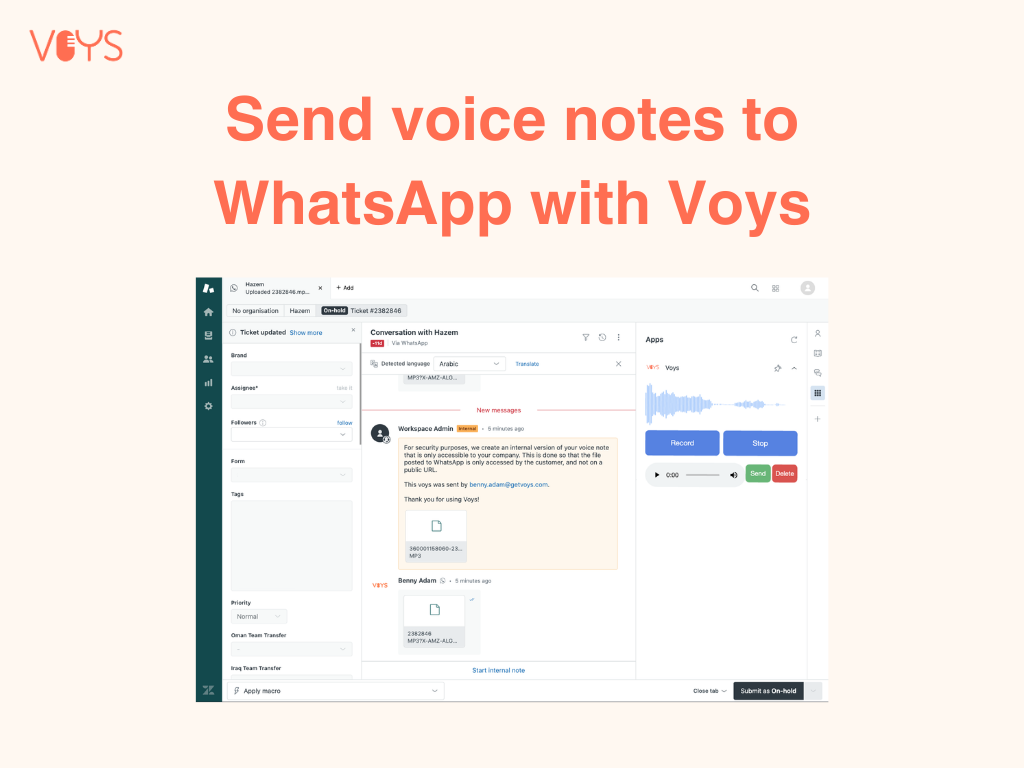 Send voice notes directly from Zendesk to WhatsApp with the Voys app