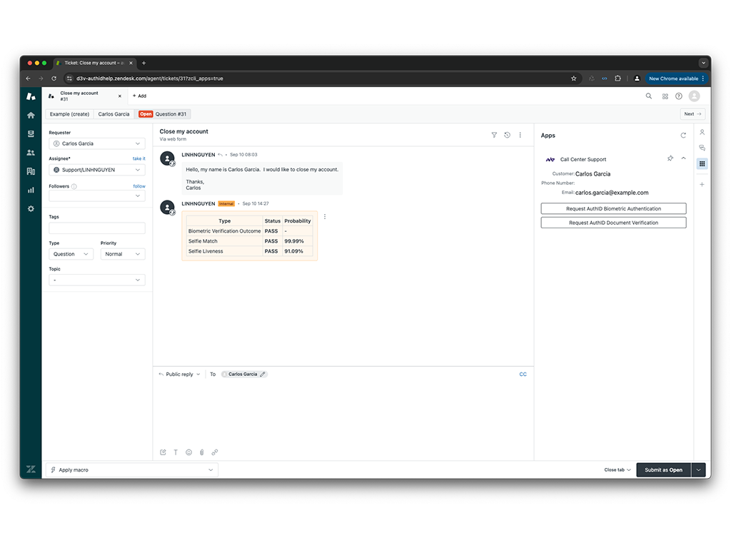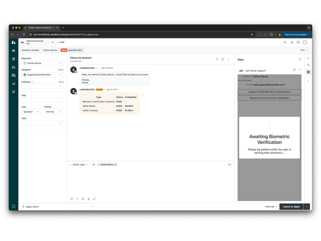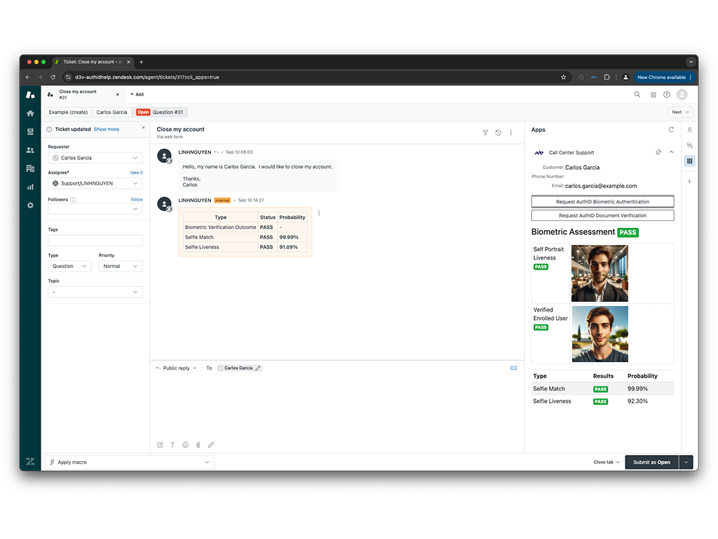 authID’s integration with Zendesk empowers companies to stop fraud at the call center or help desk with its Proof (identity verification) and Verified (biometric authentication) solutions. authID significantly improves security and efficiency in call centers by addressing key authentication challenges in customer service environments. Plus, in environments where call center staff work remotely, authID’s cloud-based, passwordless authentication provides an additional security layer by ensuring only verified agents can access systems, thus safeguarding sensitive customer data from unauthorized access.