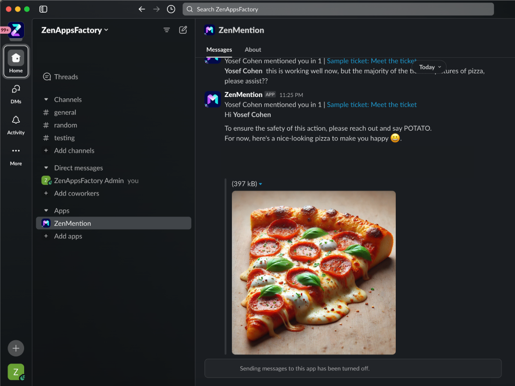 Our app ensures that every Zendesk comment mentioning an agent is sent directly to Slack, complete with the ticket link, comment text, sender’s name, and any inline images.