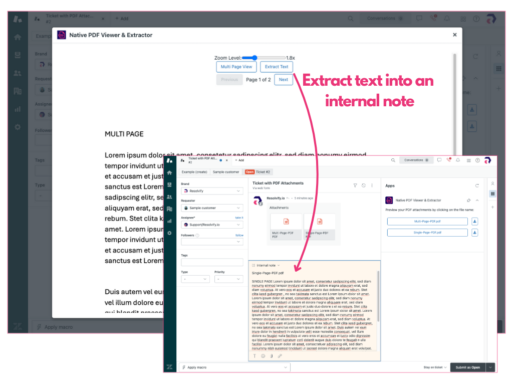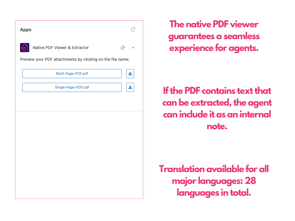 The Native PDF Viewer & Extractor app for Zendesk allows support agents to view PDF attachments directly within tickets, eliminating the need to download files before opening. If the PDF contains extractable text, agents can easily add this text to an internal note, streamlining their workflow and enhancing efficiency.