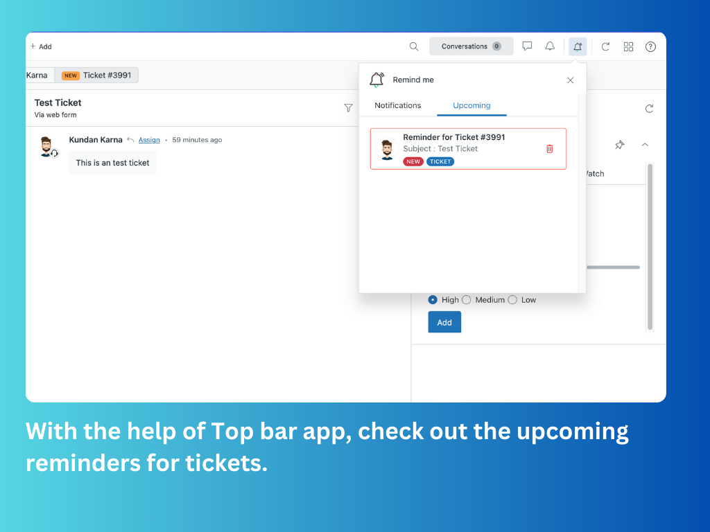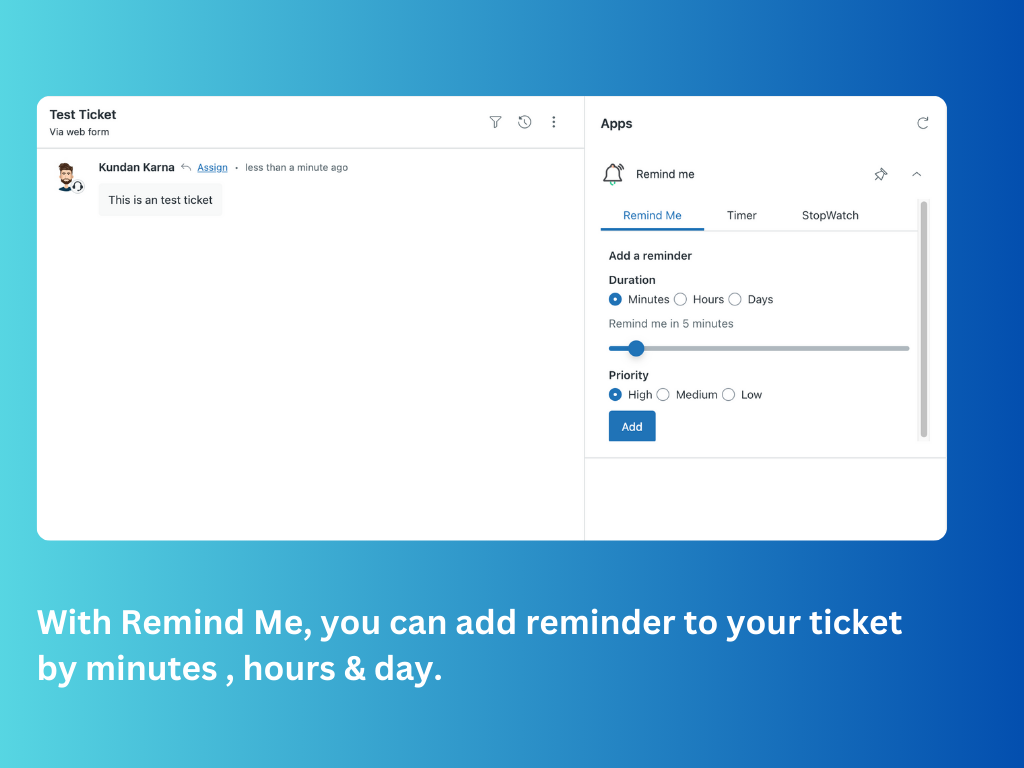 Remind Me helps support teams manage ticket follow-ups effortlessly. With a simple and intuitive interface, you can schedule reminders for any ticket and receive timely notifications—ensuring no customer request is forgotten. Whether you need to follow up in minutes, hours, or days, Remind Me keeps you on track.