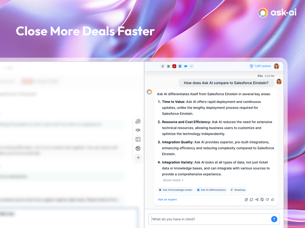 Turn every rep into a top performerGive every rep access to knowledge across any source to close tickets faster, confidently respond to customers, and get up to speed on any account or initiative