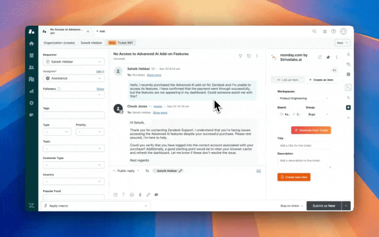Link tickets, create items using AI, and ensure seamless collaboration between support and project teams across Zendesk and monday.com. Keep work flowing between your teams through real-time, two-way updates between your team’s favorite platforms.