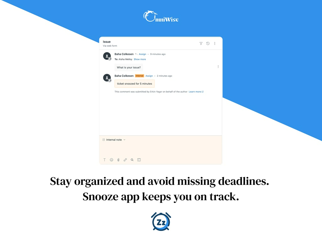 • Email Notifications: Receive email reminders when your snooze duration is up, ensuring you never miss a beat and can return to handling your tickets promptly.