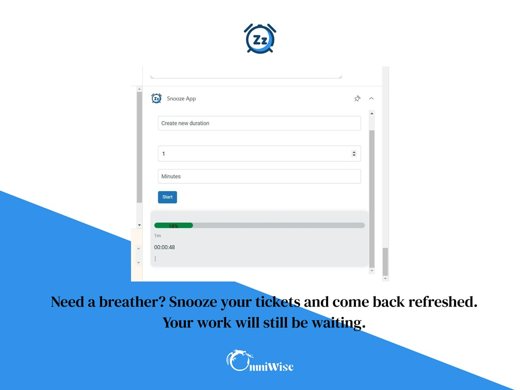 Imagine you're in the midst of a busy day, juggling multiple tasks and support tickets, and you need a short coffee break to catch your breath or a bit more time to gather all the necessary information related to a ticket.Relax, take that well-deserved break, and let Snooze APP handle the rest.With just a few clicks, you can snooze your tickets for a custom duration, giving yourself the breathing room you require.