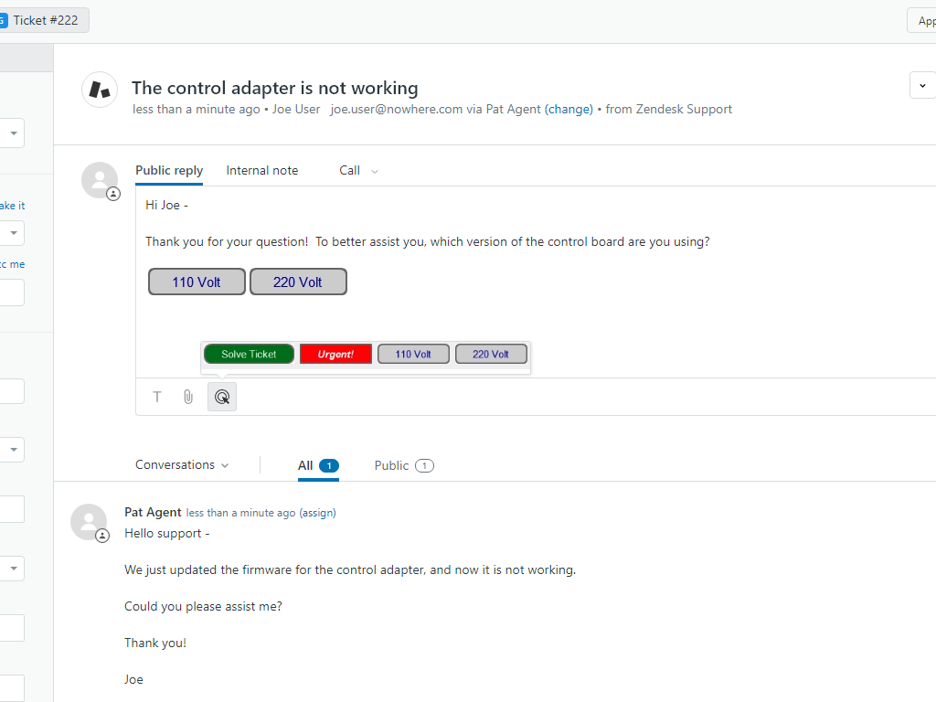 Add multiple buttons to an email to present choices to the customer. Add more than one action into the same button for greater functionality. Combine these actions with Zendesk triggers for an even more powerful workflow: