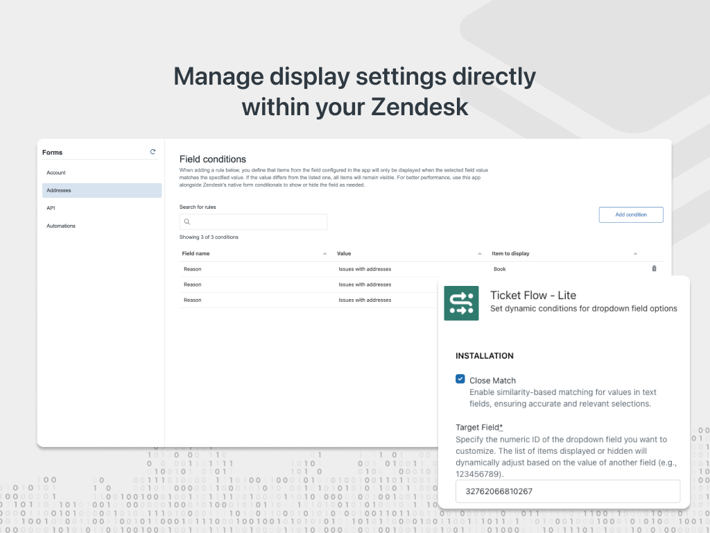Ticket Flow revolutionizes ticket management by giving administrators the power to customize dropdown field options based on ticket context. Agents see only the most relevant information, tailored to the ticket’s form and classification, ensuring clarity and efficiency. This app provides extended functionality for Zendesk, enabling advanced field customizations without compromising data integrity or administrative ease.