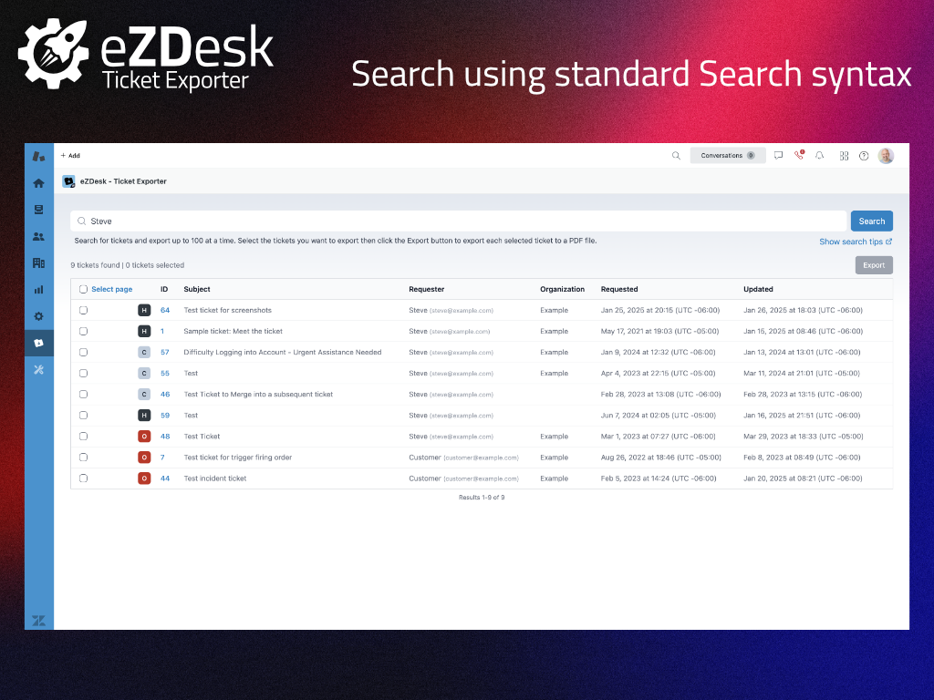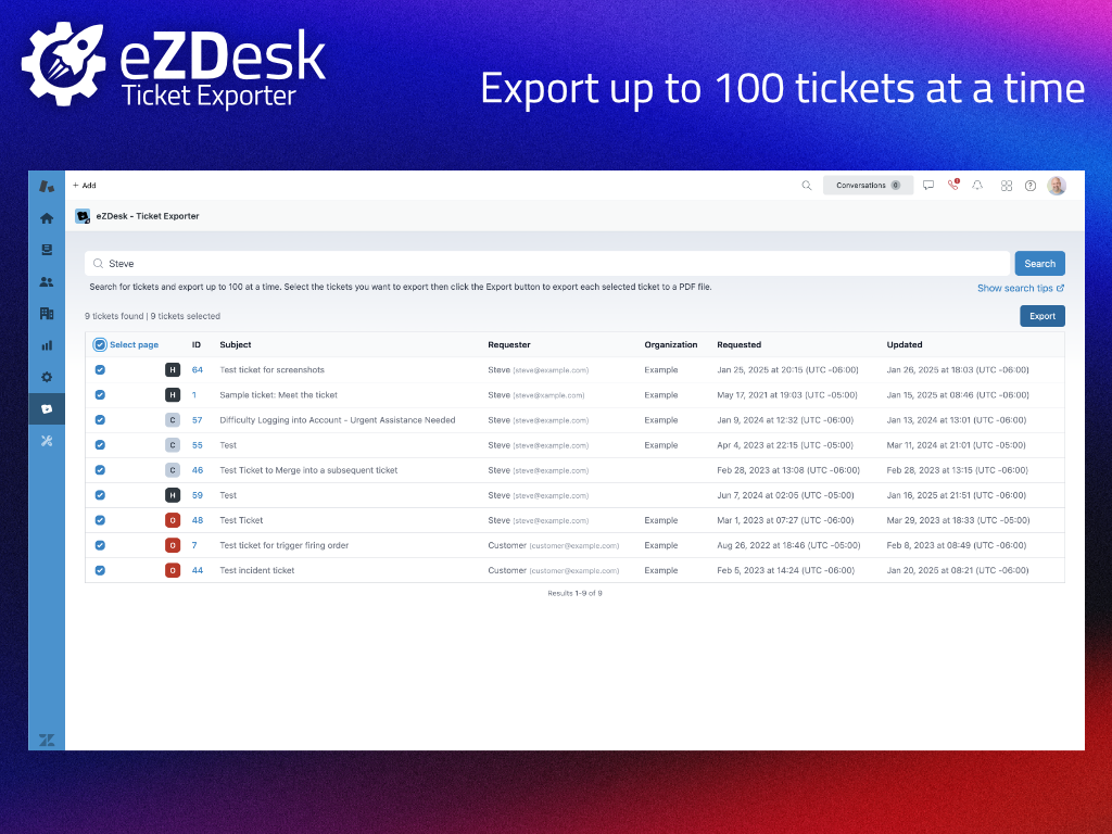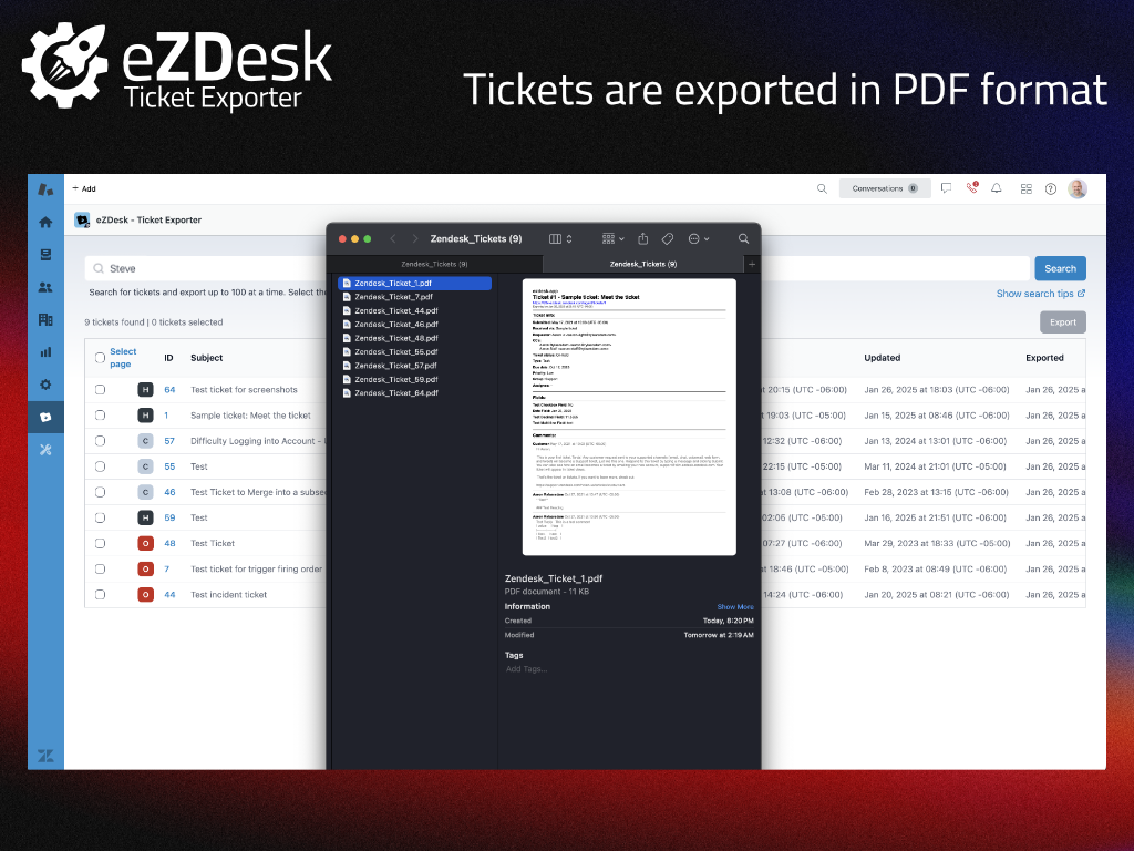 Need a simple way to pull ticket data for audits, reports, or documentation? eZDesk - Ticket Exporter lets you search, filter, and export Zendesk tickets into formatted PDF reports—quickly and efficiently.
