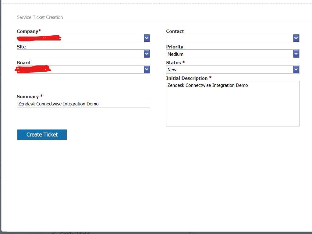 The Create ticket: lets the Zendesk user create a new ticket # in ConnectWise platform. The Support agent can select different fields like company, site , board, Contact, Custom Fields, Upload Fields. Based on Zendesk user inputs and selections in the Create new ticket form, the ticket will be created instantly in the ConnectWise and then display the corresponding information details will be displayed in the ConnectWise integration app.