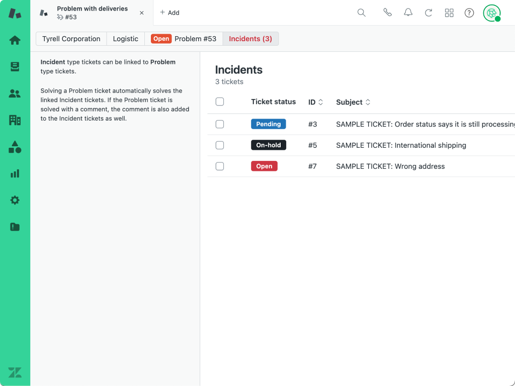 Zendesk’s problem and incident ticket types allow you to link multiple related tickets together and handle them as one big issue. Any update you send to a problem is automatically reflected on all linked incident tickets, making it easy to manage widespread problems or related issues from within Agent Workspace.