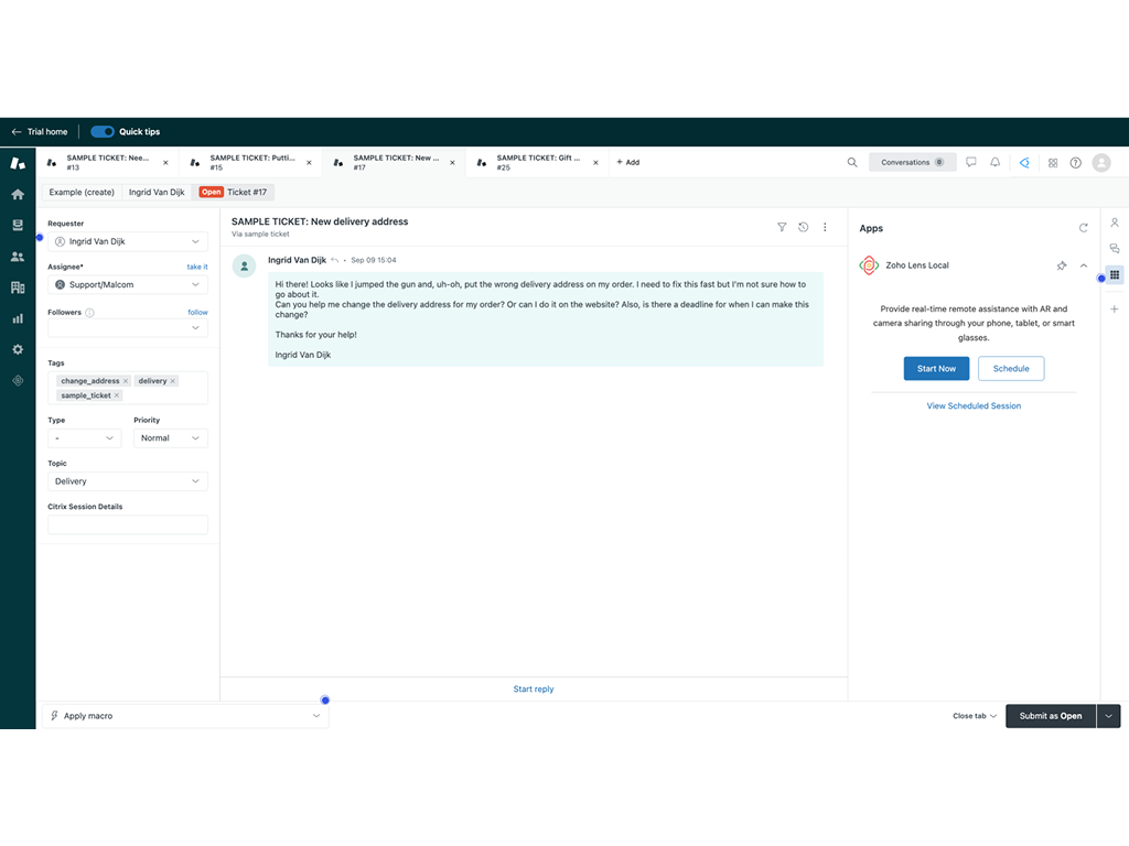 Initiate Zoho Lens remote assistance from Zendesk tickets for real-time support.