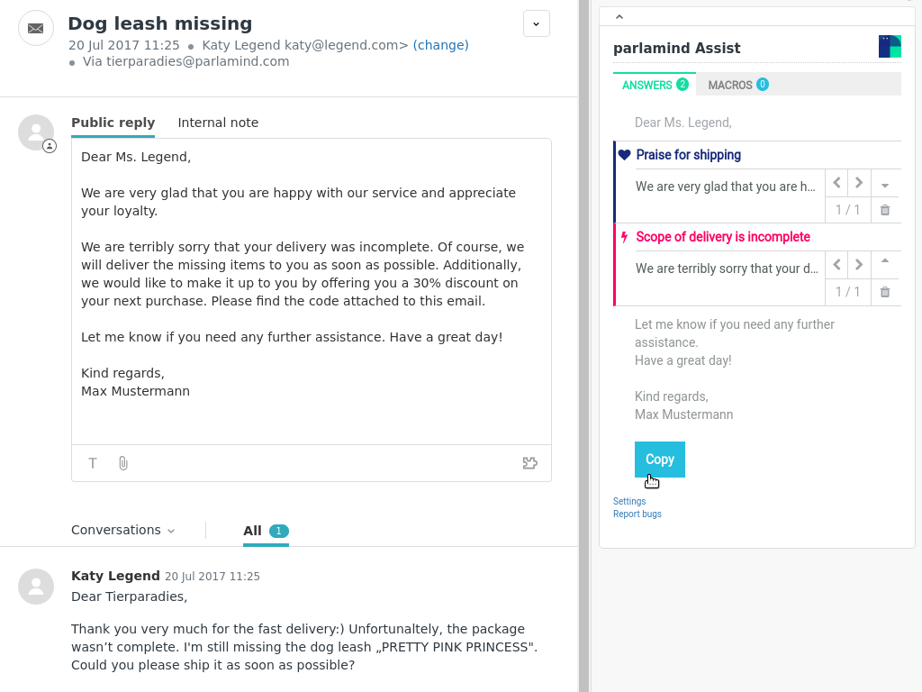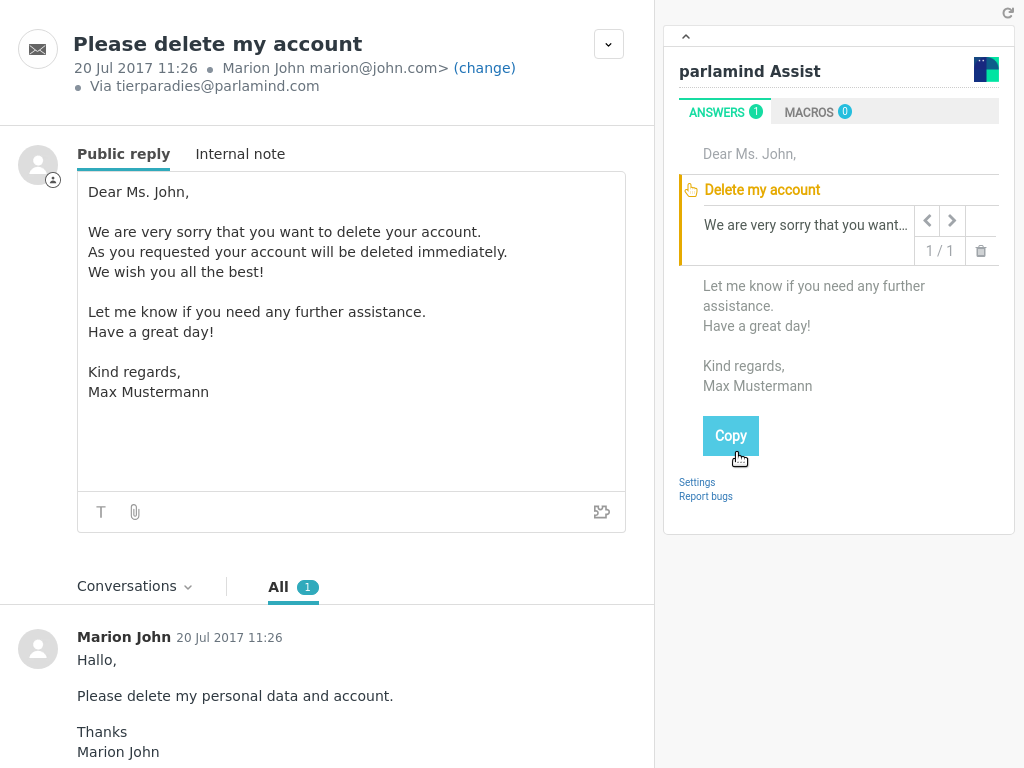 • Be faster and more productive: parlamind Assist pre-composes a suitable answer upon opening the ticket. Quick review, one click, and you are good to close the ticket.