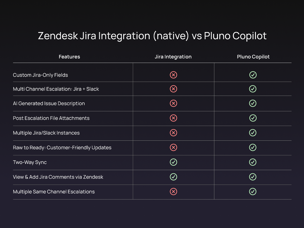 Pluno manages escalations for you; one click escalates tickets from Zendesk to Jira or Slack with all context to jump in and resolve the issue.