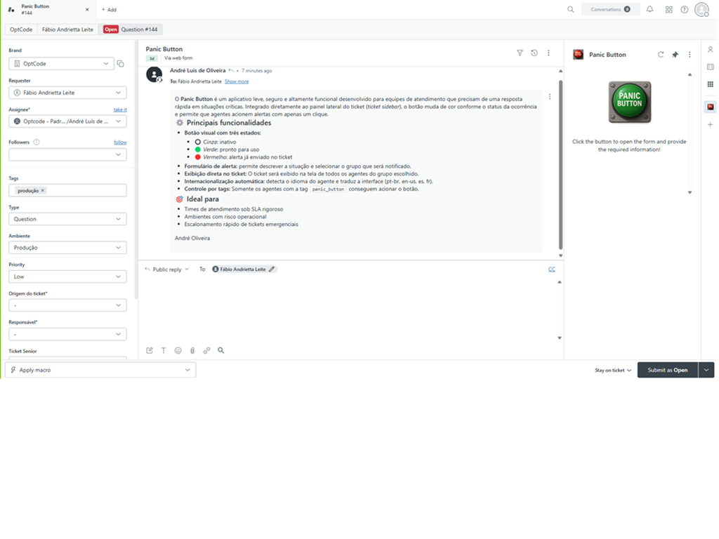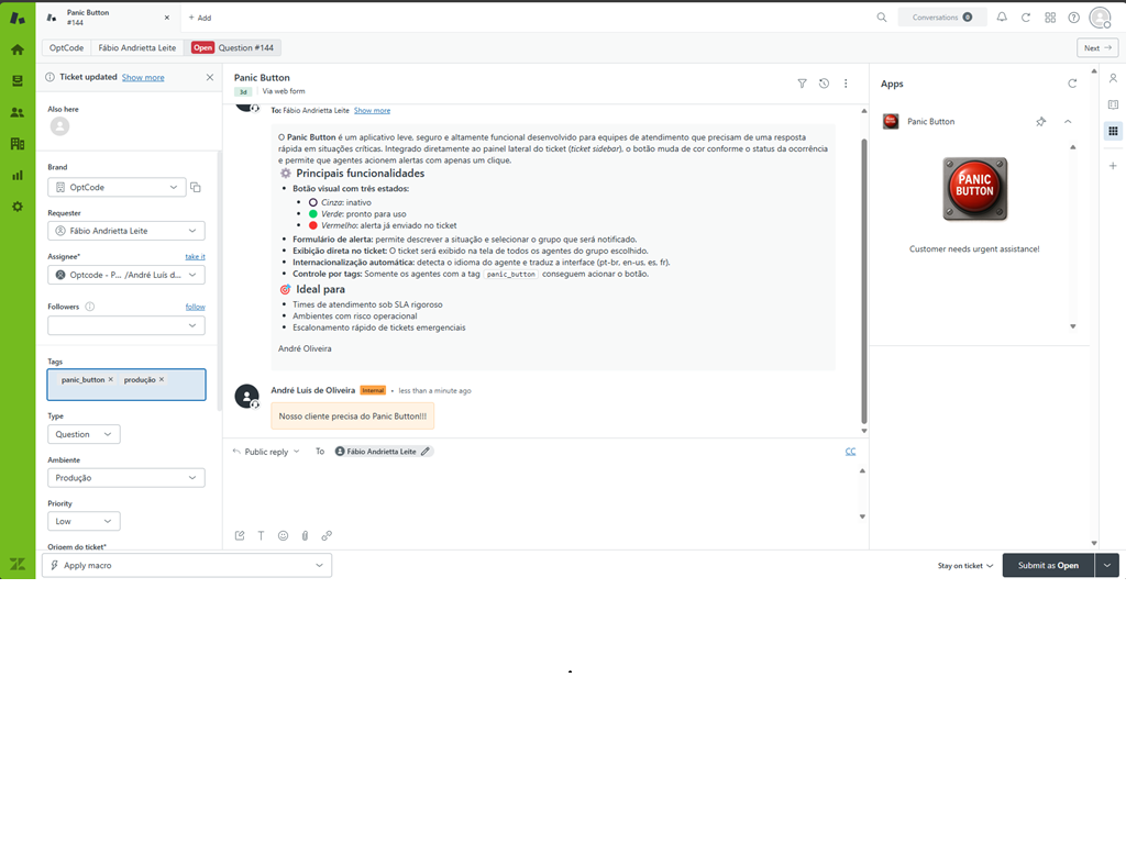 The Panic Button is a lightweight and powerful tool that empowers agents to instantly escalate urgent tickets across your Zendesk environment. With a simple, color-coded button added to the ticket sidebar, your team gains the visibility and responsiveness needed to deliver fast, coordinated support when it matters most.