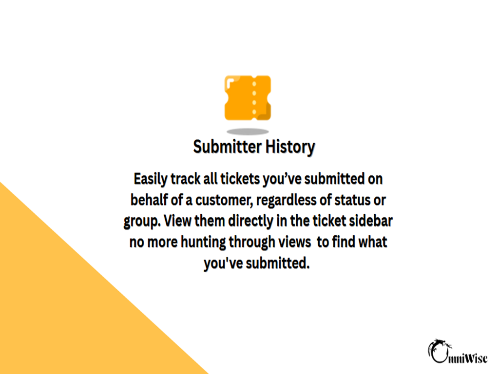 Easily track the tickets you've submitted. Submitter History displays a real-time list of all open, pending, hold, and new tickets created by the current agent on behalf of the customer — right inside the ticket sidebar.Whether you're following up on a customer issue or checking the status of previously submitted tickets that may not belong to your group or organization, Submitter History makes it fast and effortless.