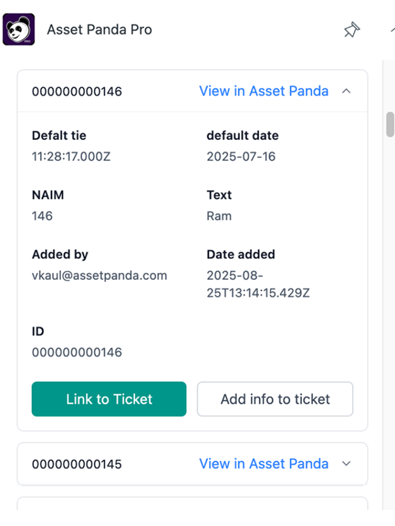- You will see the Asset Panda Pro app in the ticket sidebar.